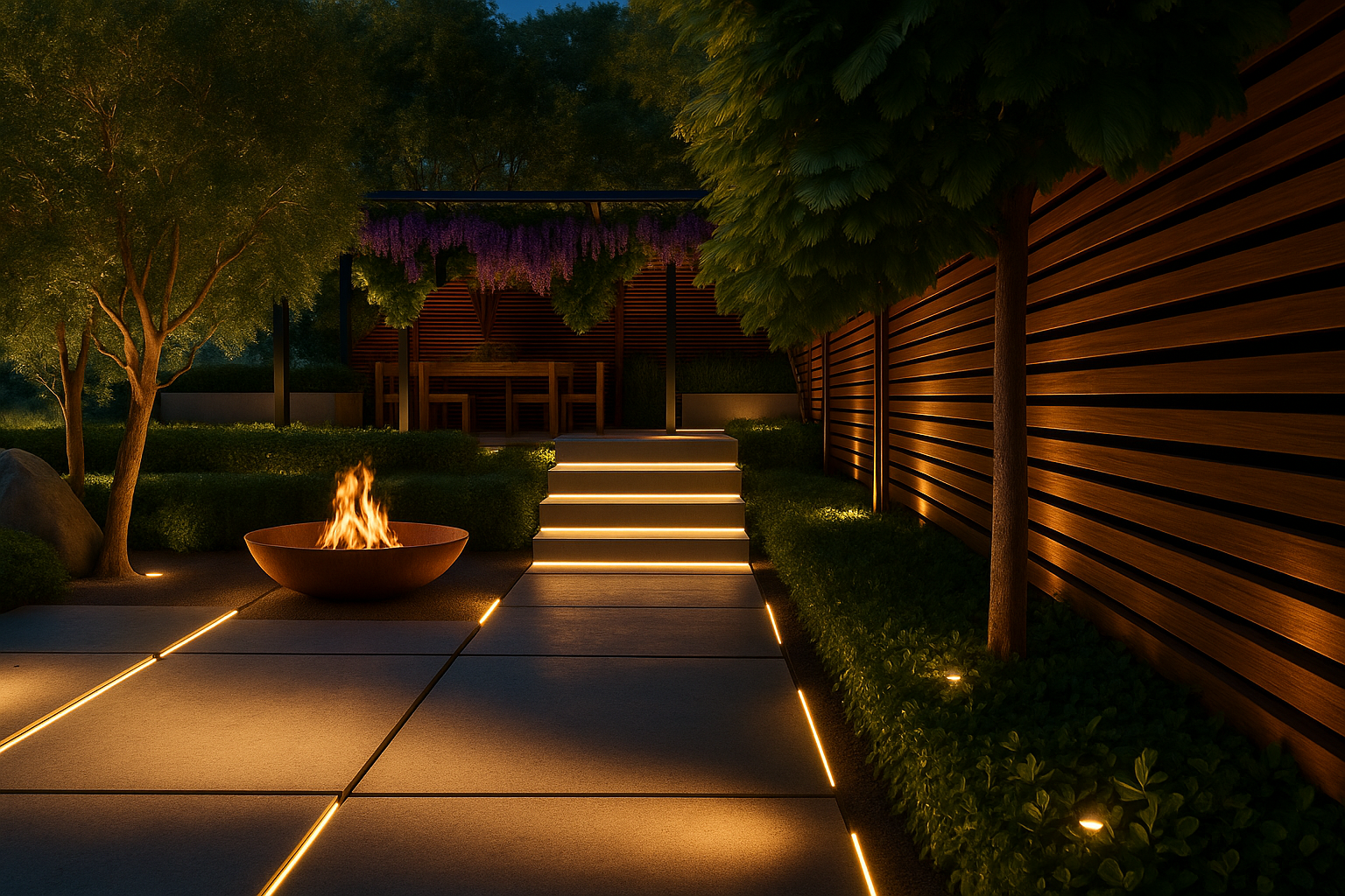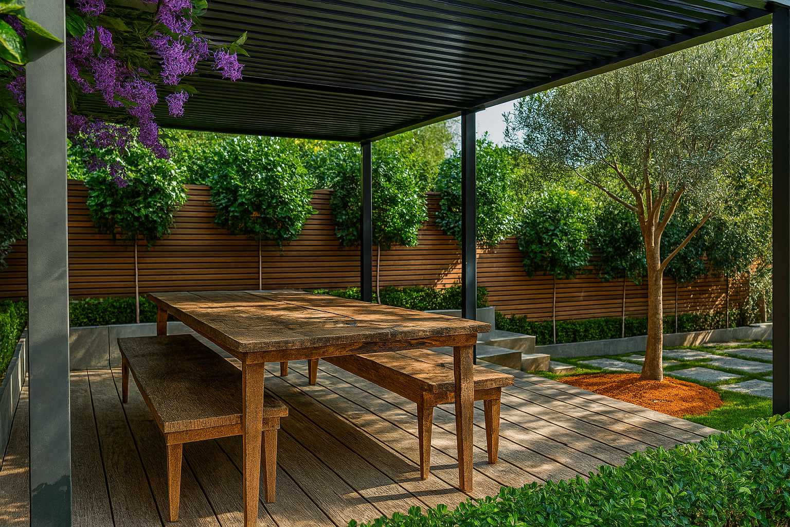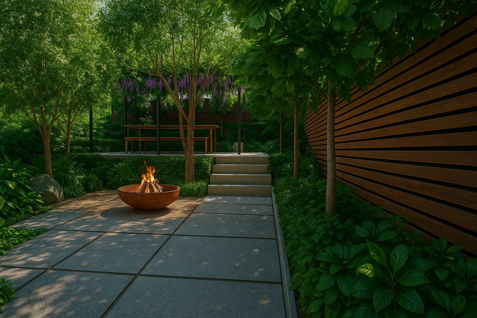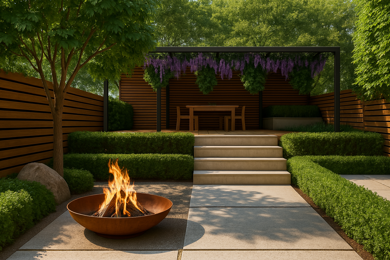 A clean lined modern back yard & front garden with rustic & timeless materiality - The Brooklyn Modern rustic oasis is an inviting & dynamic urban residential landscape meant to act as a picturesque viewing garden with simple programatic design : outdoor dining under a custom black wood pergola with lush Japanese wisteria & subtle lighting, family & friends gathering around a corten steel rustic fire-pit, & a modern elegant flow of materials & geometries. The Garden is framed by European Hornbeams & boxwoods with large natural stone boulders breaking up the geometry.