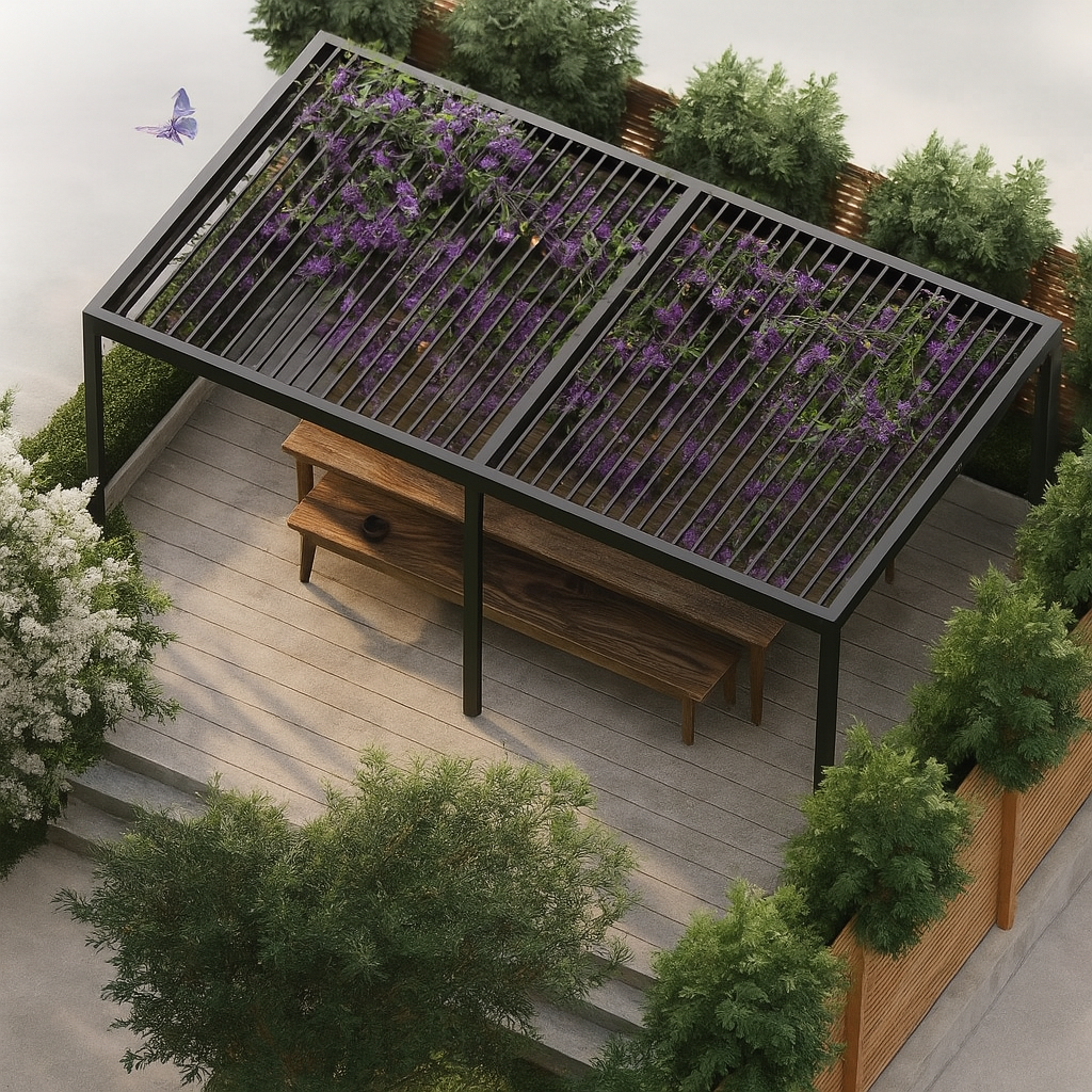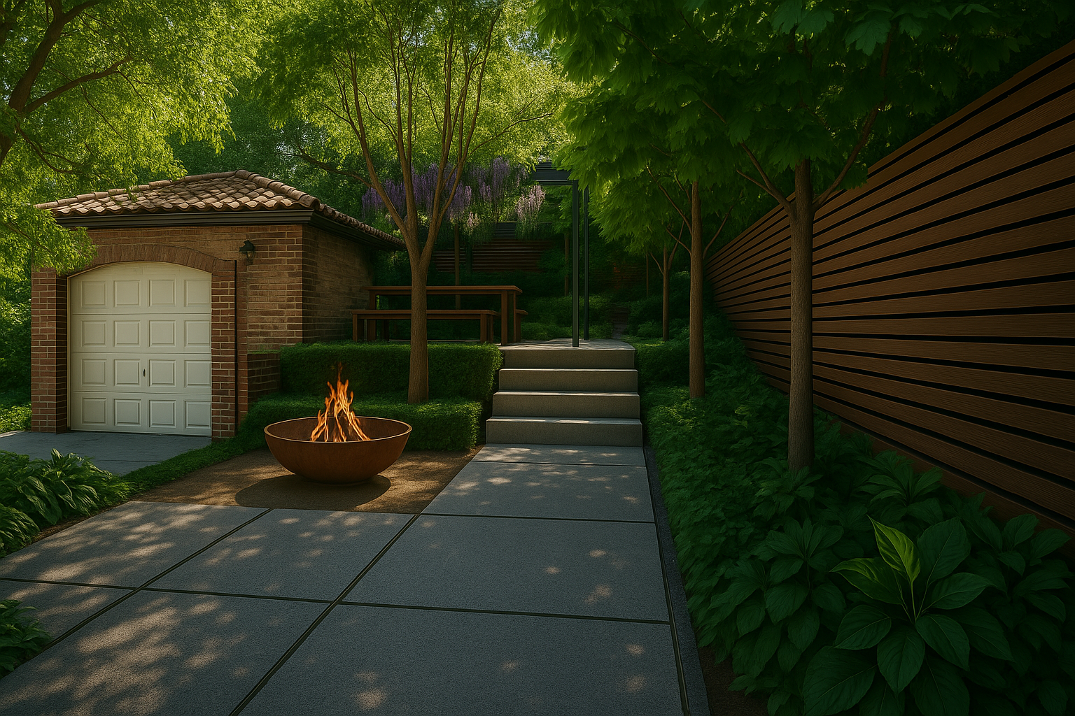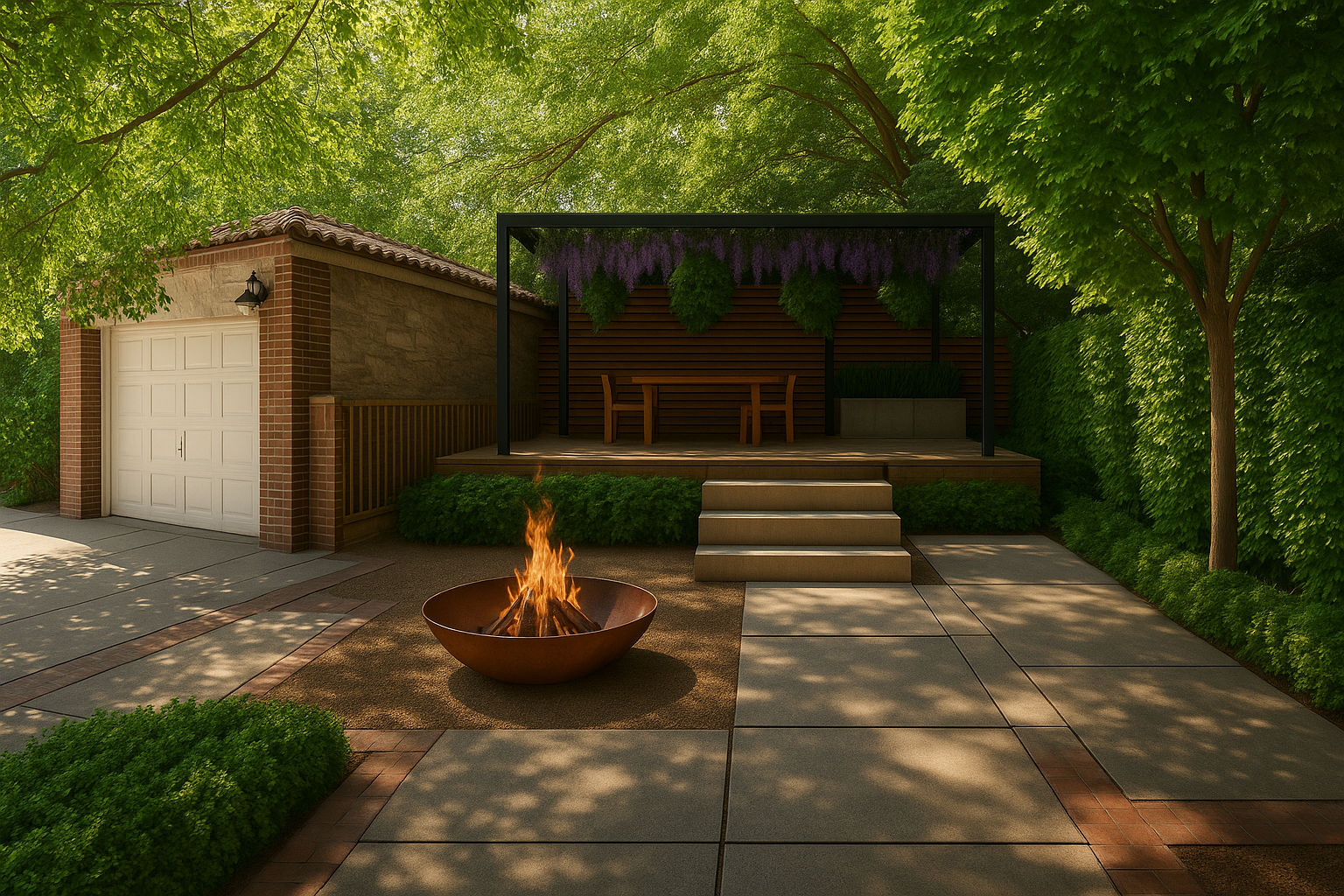 A clean lined modern back yard & front garden with rustic & timeless materiality - The Brooklyn Modern rustic oasis is an inviting & dynamic urban residential landscape meant to act as a picturesque viewing garden with simple programatic design : outdoor dining under a custom black wood pergola with lush Japanese wisteria & subtle lighting, family & friends gathering around a corten steel rustic fire-pit, & a modern elegant flow of materials & geometries. The Garden is framed by European Hornbeams & boxwoods with large natural stone boulders breaking up the geometry.