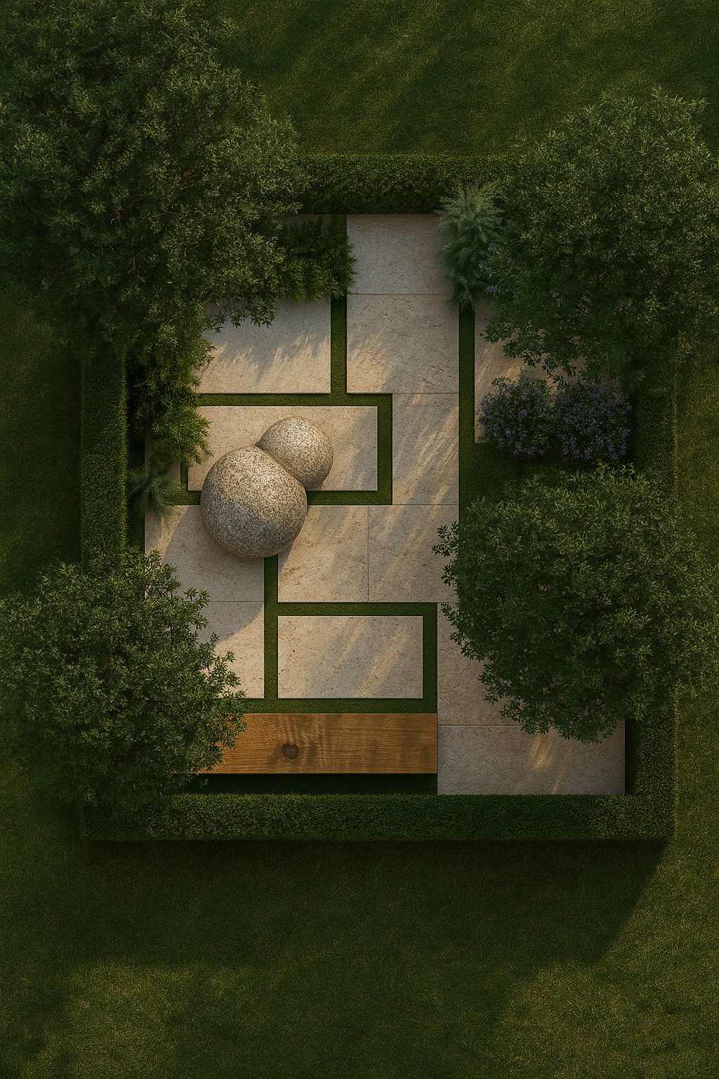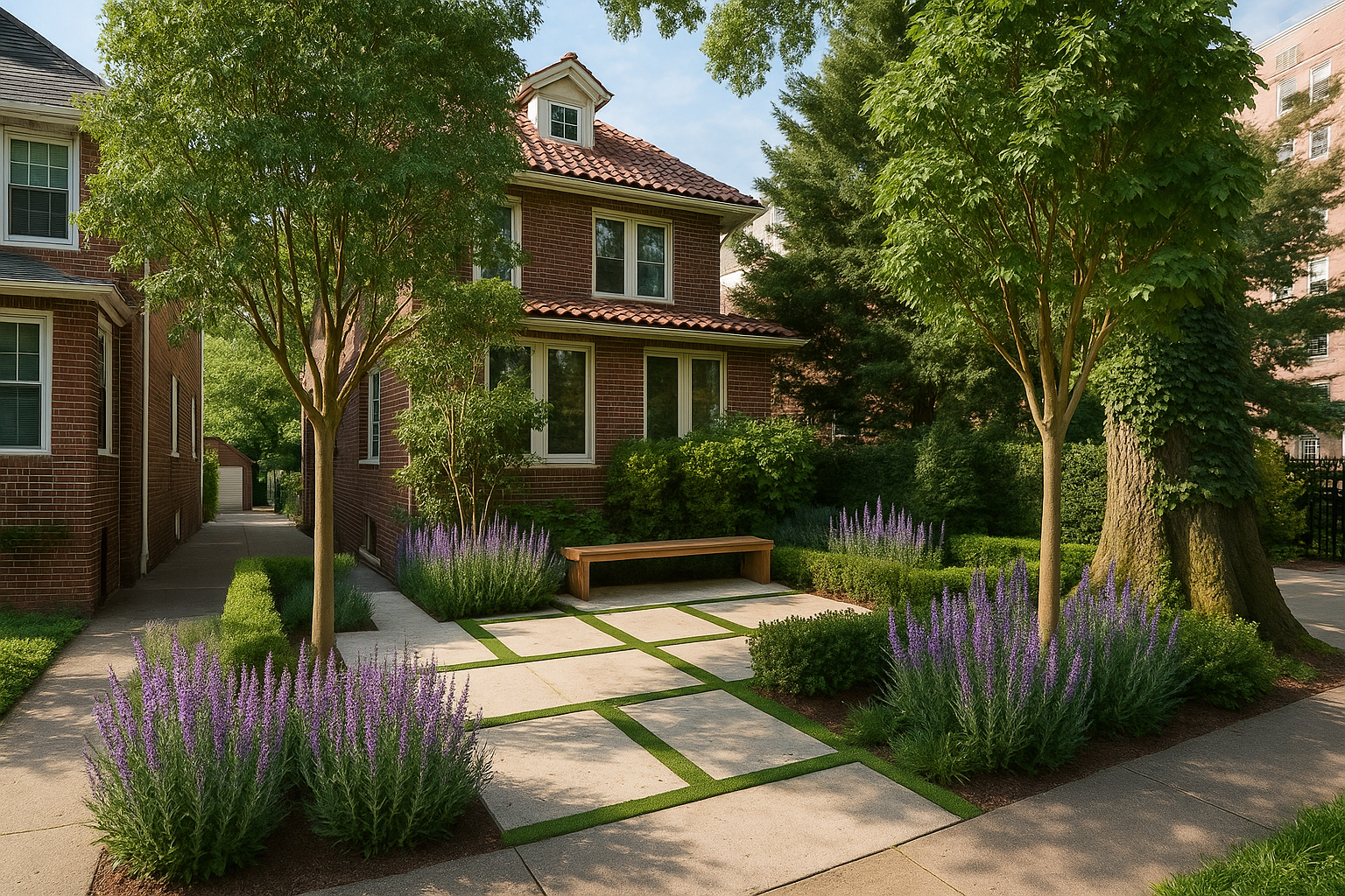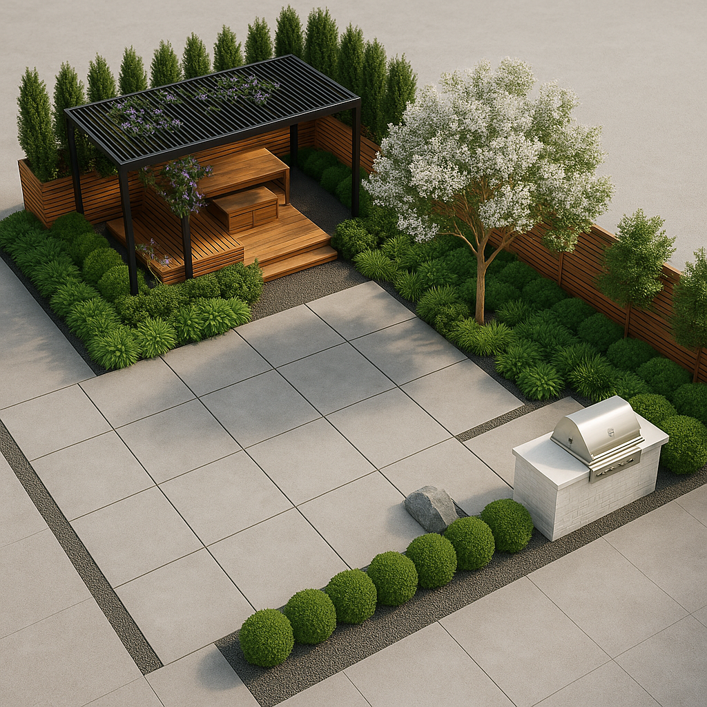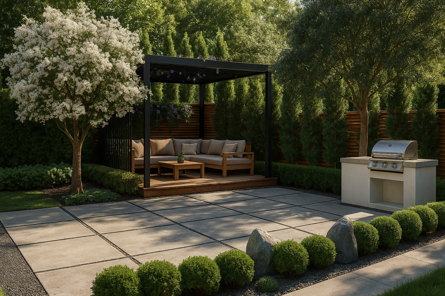 A clean lined modern back yard & front garden with rustic & timeless materiality - The Brooklyn Modern rustic oasis is an inviting & dynamic urban residential landscape meant to act as a picturesque viewing garden with simple programatic design : outdoor dining under a custom black wood pergola with lush Japanese wisteria & subtle lighting, family & friends gathering around a corten steel rustic fire-pit, & a modern elegant flow of materials & geometries. The Garden is framed by European Hornbeams & boxwoods with large natural stone boulders breaking up the geometry.