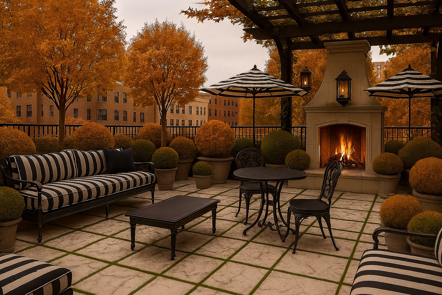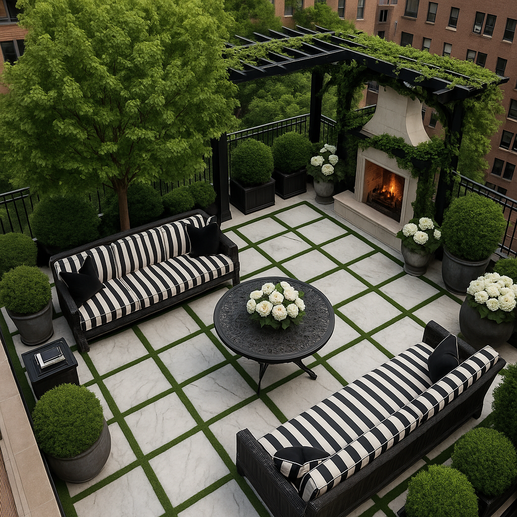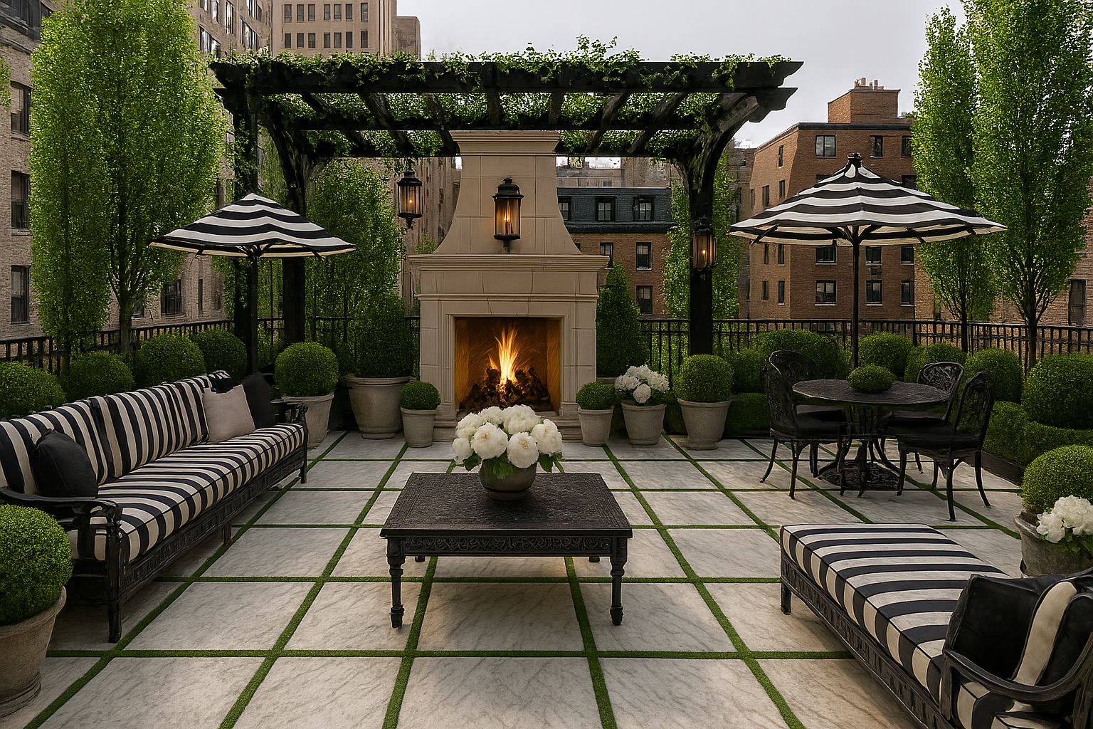 inspired by luxury brands and hotels - the Black & White Lux Garden was created for this pre-war classic architectural building. A large stone outdoor fireplace, classic iron site furnishings and contemporary planters & plant design adds a luxury style outdoor roof to the clients of the penthouse.