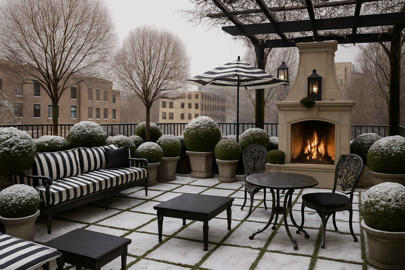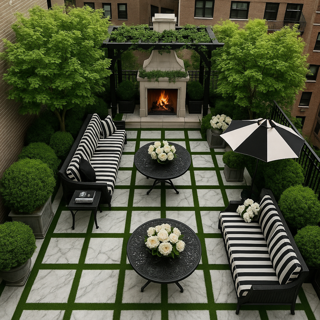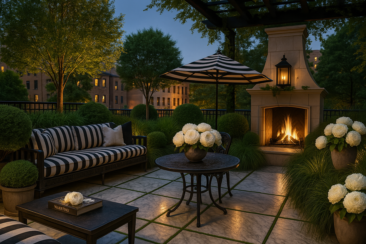 inspired by luxury brands and hotels - the Black & White Lux Garden was created for this pre-war classic architectural building. A large stone outdoor fireplace, classic iron site furnishings and contemporary planters & plant design adds a luxury style outdoor roof to the clients of the penthouse.