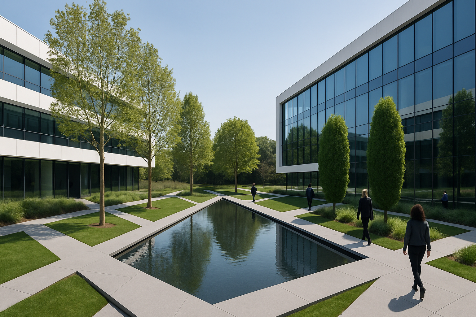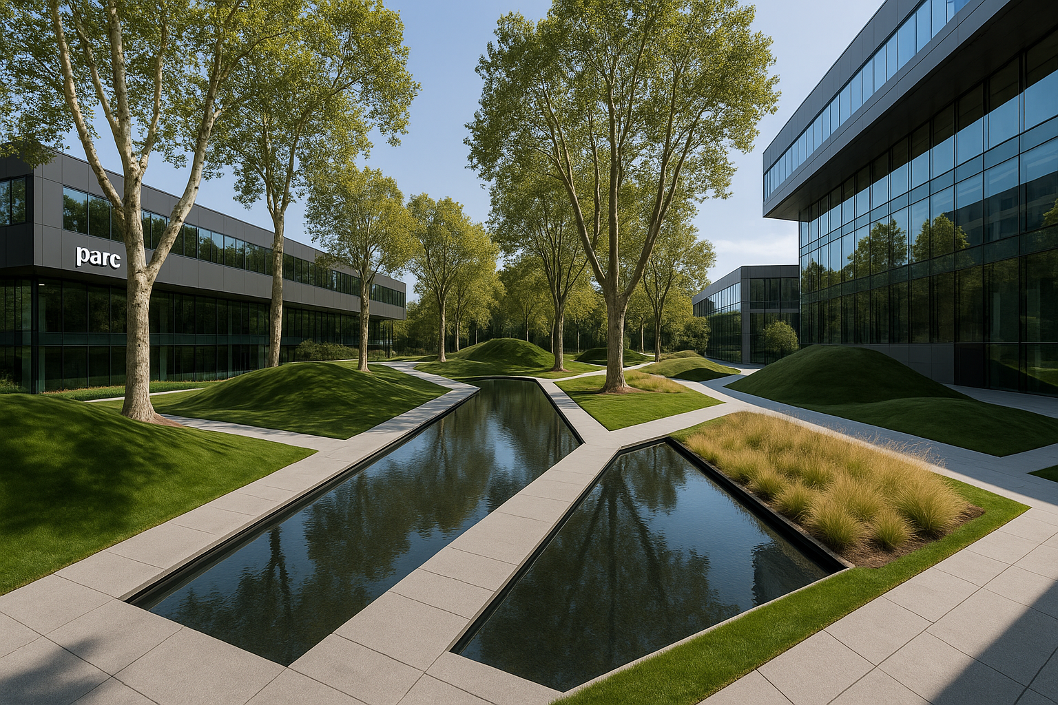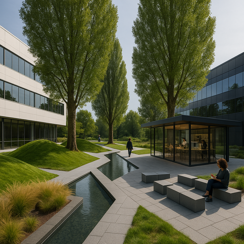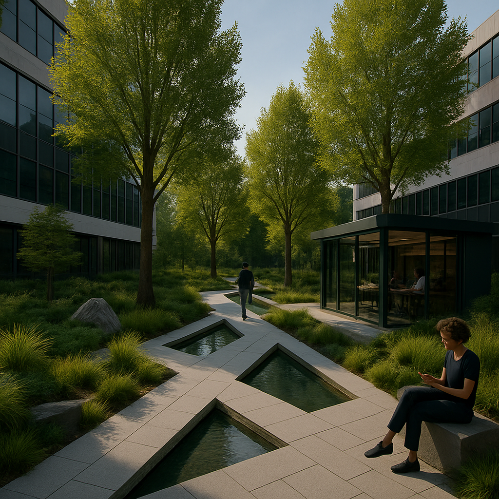 a modern corporate park design was created for this large New Jersey based Law Firm. inspired by Parc de Citron in Paris circulation was a main thread of the design with moments and outdoor areas for gathering and reflection was designed to allow an open dialogue between landscape and user.