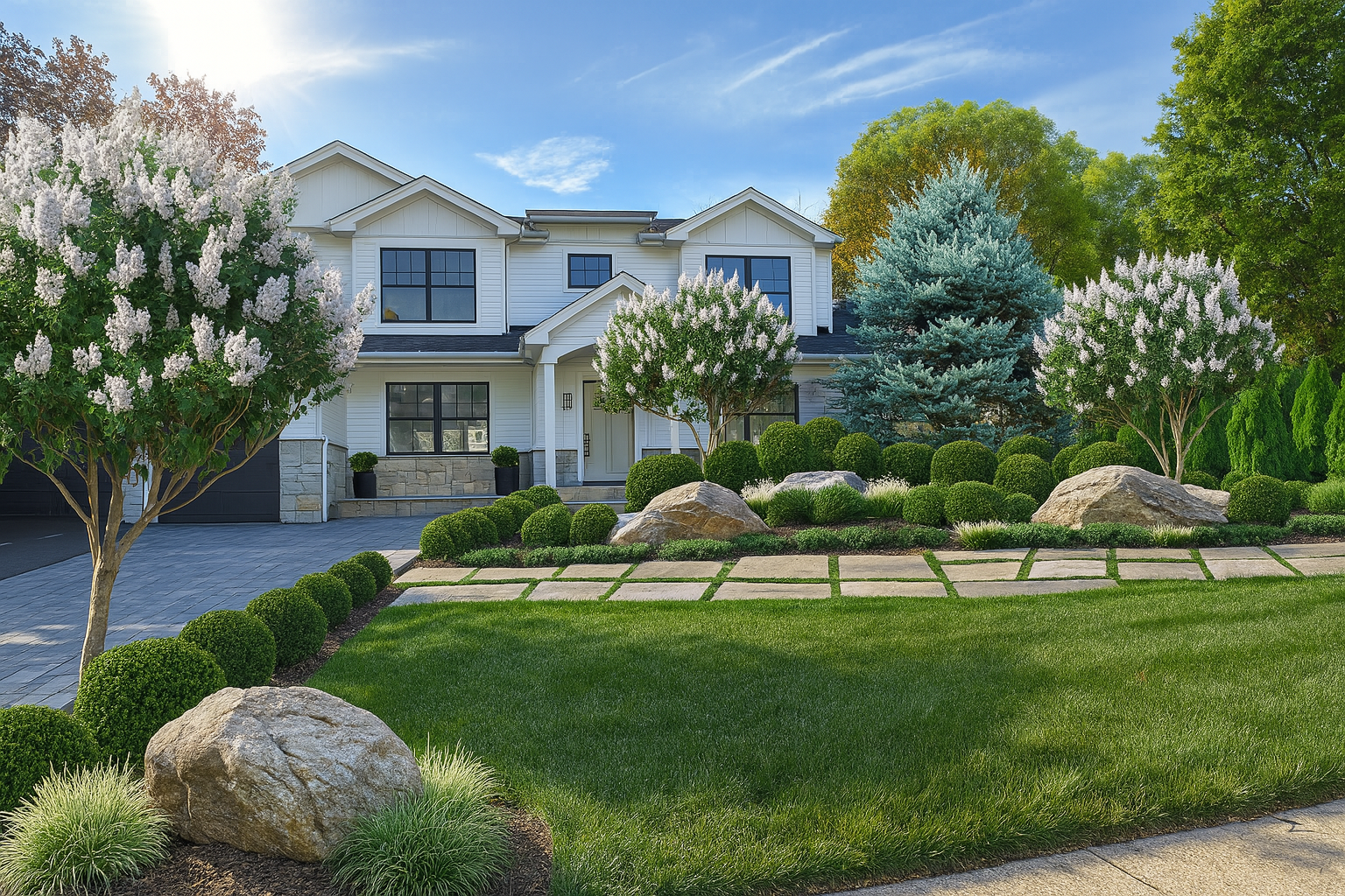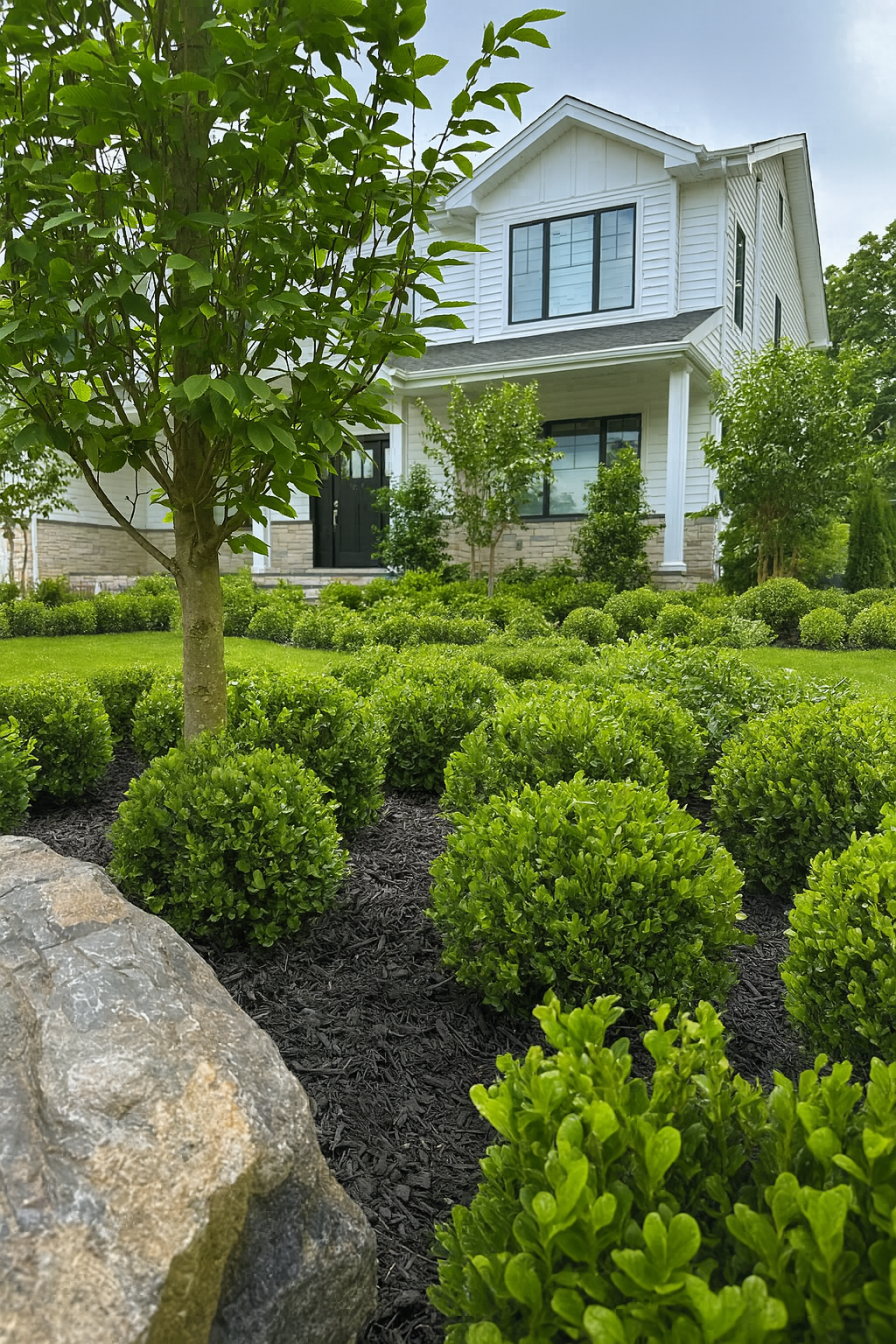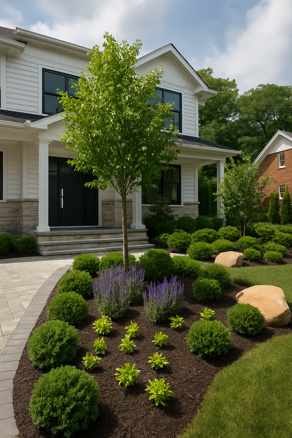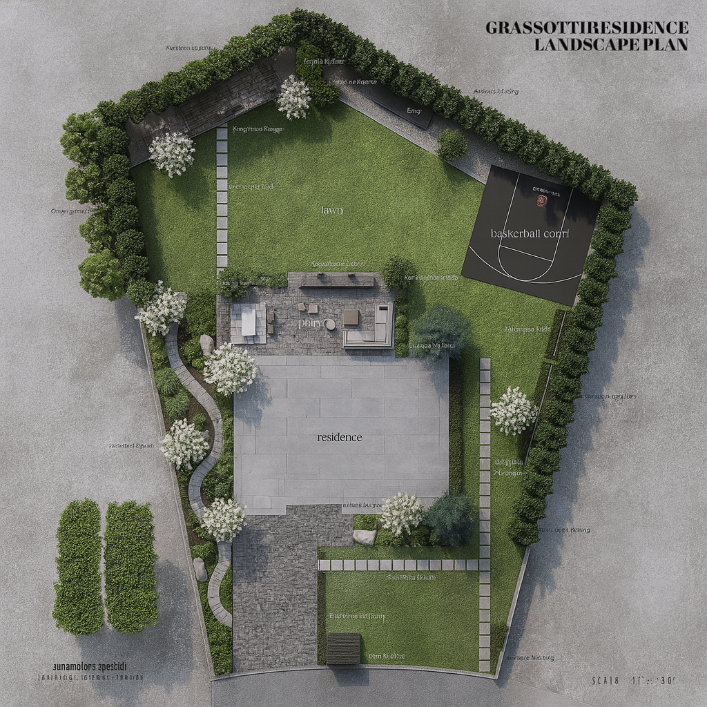 ALS has set out to create a Contemporary / Classic Residential Landscape through the integration of timeless & sophisticated materials and simple programming. The Landscape Design uses a simple pallette of Plant Material with varying shades of Green and white as the accent color, the material selection provides year round vegetation & color. Natural Stone Materials & Surfaces are used throughtout the design to create a rustic, strong gray color pallette - Large Stone Slabs are used as walking surfaces, Decomposed Granite surfaces create a unique texture surface, The Outdoor Kitchen & Fireplace is finished with Stone Cladding, and large Natural Boulders which are strategically positioned throughout the property. Respecting the Architectural Design and clean lined elegance of the Residence the Landscape serves as a perfect harmony to the Residence and maximizes the potential and positioning of the land around the residence. The Programming of the design provides a mix of activity & engagement for everyone - play a game of pick up on the half court b-ball court, pick fresh vegetables & herbs in the vegetable garden plots, cozy up near the Stone Hearth Fireplace, or sit on the front porch & take in the landscape of your front yard.