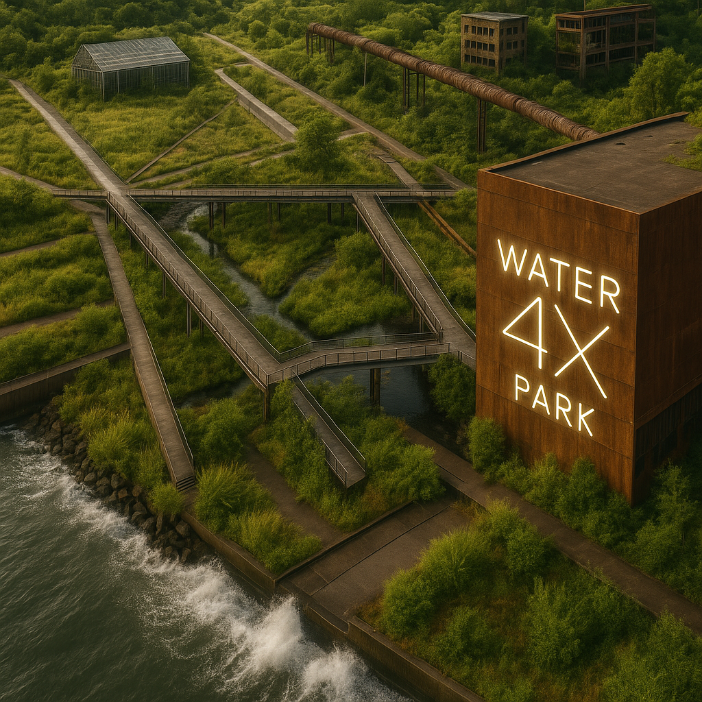 A raw, wild, industrial, ecologically shifting modern park vision & design, meant to capture the industrial, decaying past & history of this forgotten parcel of waterfront land. Water 4x allows the tides, movement, flow and power & beauty of the sea to shape & shift the landscape, bringing its users closer to nature in a pure, raw way. Water 4x creates a completely unique experience for its users tearing up the classic model, formulaic idea of what a park can be. Nature takes over in everyday here at Water 4x, from season to season year to year the park is a completely new sensory, textural quality.