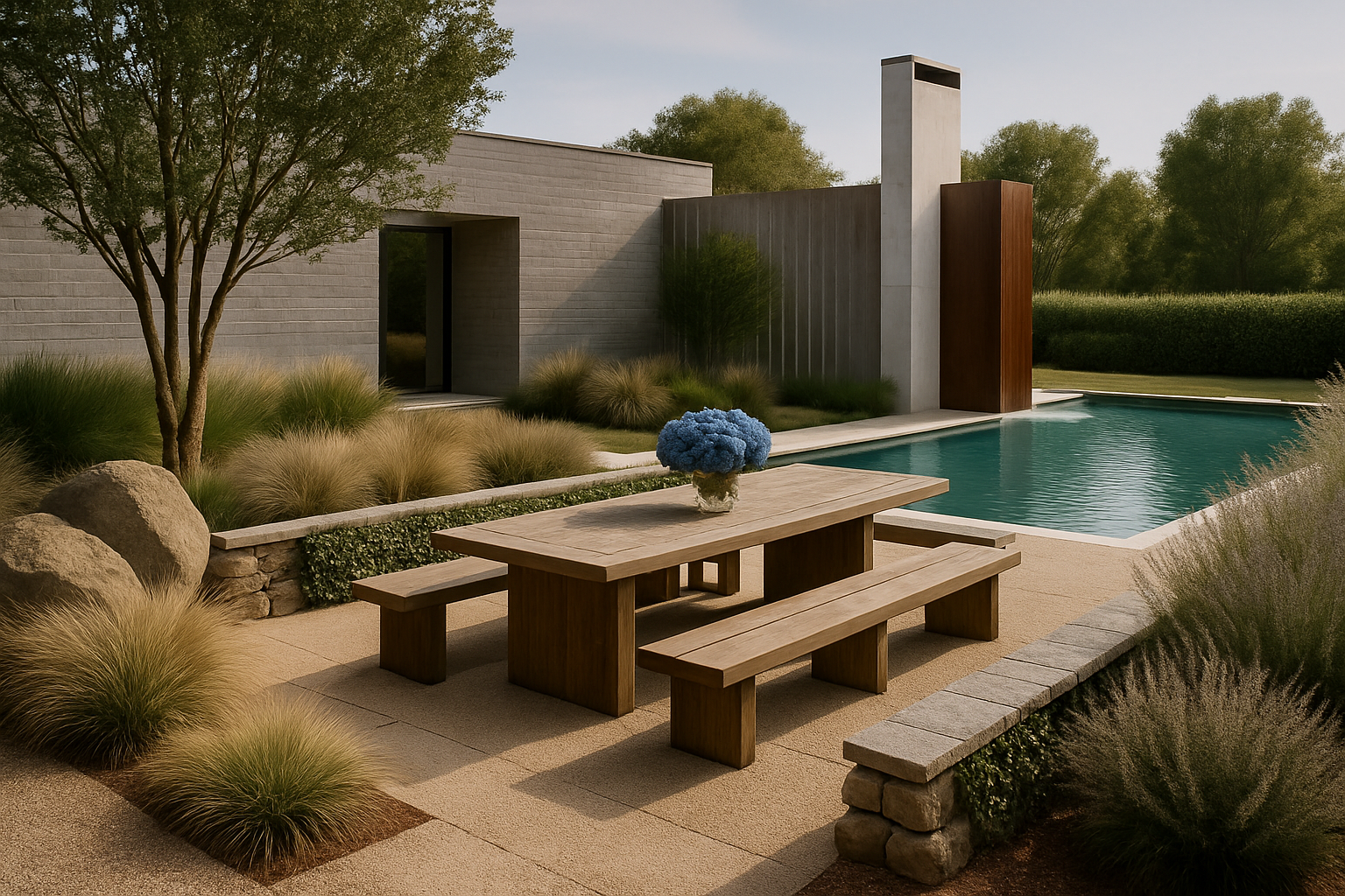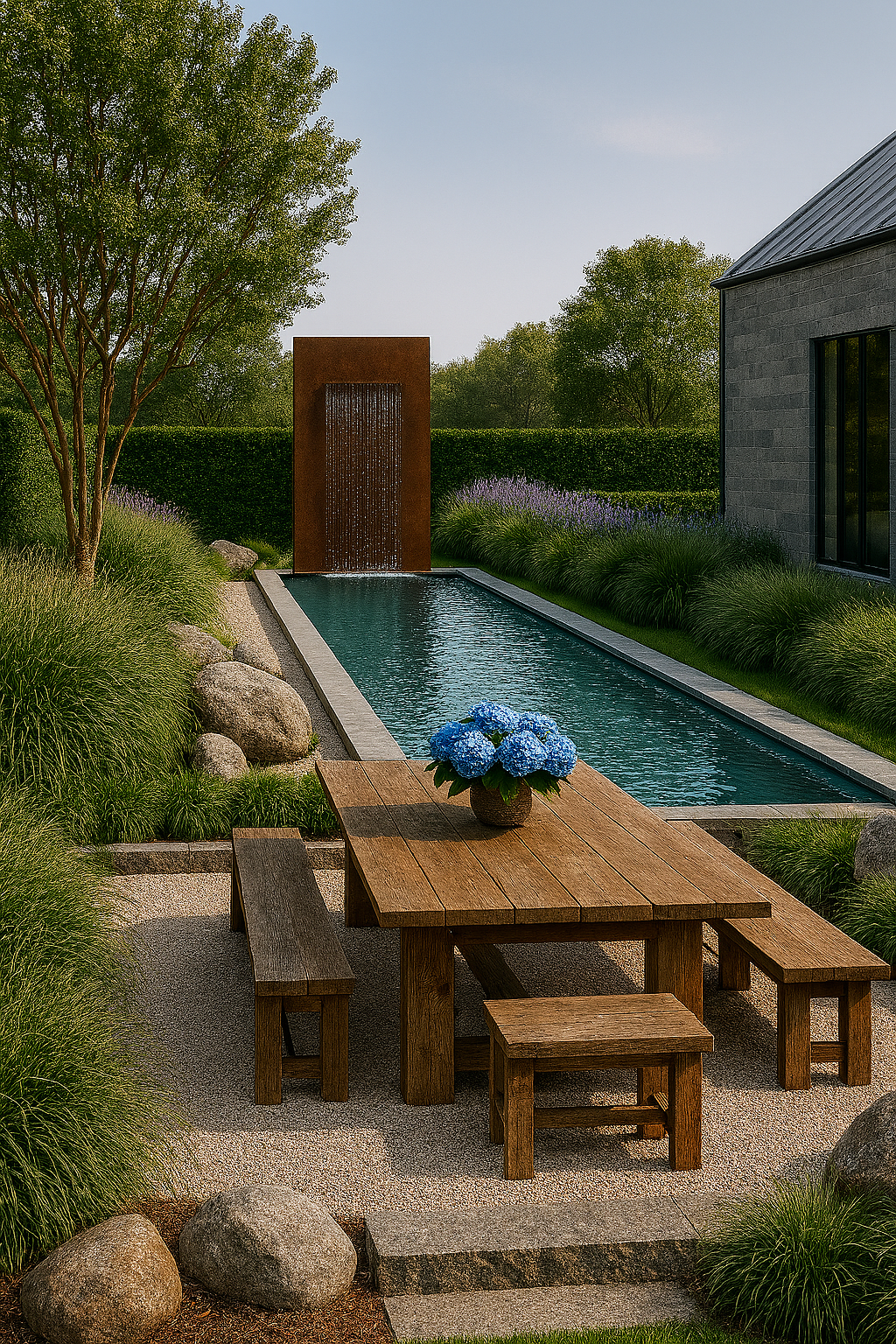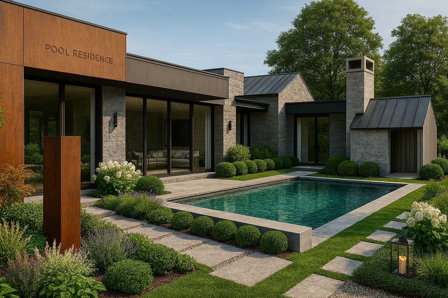 a contemporary, Hamptons beach style landscape was design to seamlessly blend into the state of art modern glass, stone & steel residential structure. The landscape extends out from the residence create a seamless indoor outdoor lifestyle.